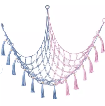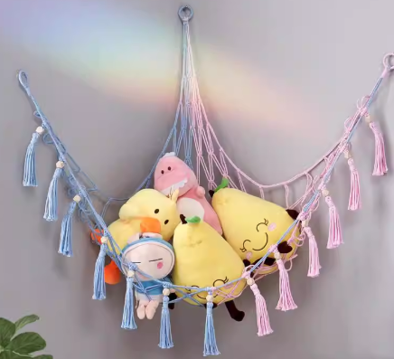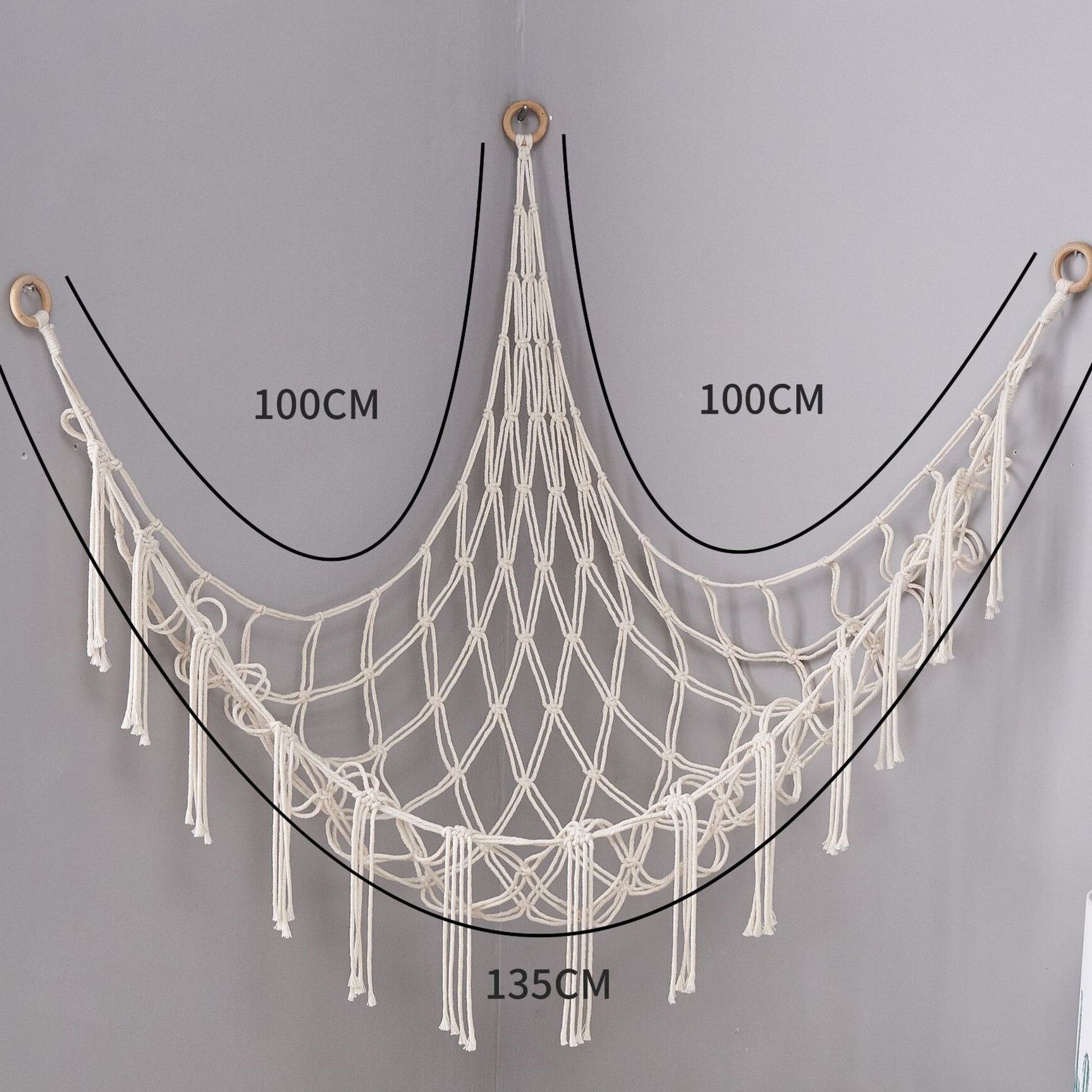 お部屋の角を活用してぬいぐるみ収納ができるハンモックタイプの整理網です。 手編み風のマクラメデザインが可愛らしく、インテリアとしても映える仕上がりになっています。 三点吊り下げ式で安定感があり、たくさんのぬいぐるみをすっきり収納できます。 壁や天井のフックに簡単に取り付けられ、子供部屋やリビングの空間を有効活用できる便利な収納アイテムです。