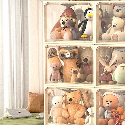 大切なぬいぐるみを美しく飾りながら収納できる透明扉付きの棚です。 10個の独立したボックスを自由に組み合わせられるので、お部屋のスペースに合わせてレイアウト可能です。 前面が透明なのでお気に入りのぬいぐるみをいつでも眺められ、ほこりからもしっかり守ります。 子供部屋やリビングに置いても圧迫感がなく、インテリアとしても楽しめるぬいぐるみ収納アイテムです。 縦に積み重ねても横に並べても使える便利な収納棚として活躍します。