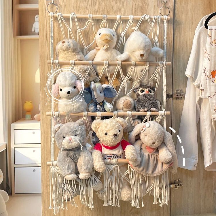 増え続けるぬいぐるみをおしゃれに整理できる壁掛け式のハンモックです。 木製の棒と編み込まれた紐で作られた四段構造で、たくさんのぬいぐるみをディスプレイしながら収納できます。 金属製のリングで壁やドアに簡単に取り付けられ、子供部屋をすっきり片付けられます。 ぬいぐるみ収納としてだけでなく、インテリアとしても可愛らしい雰囲気を演出します。 底部の飾り紐がナチュラルな風合いを添えています。