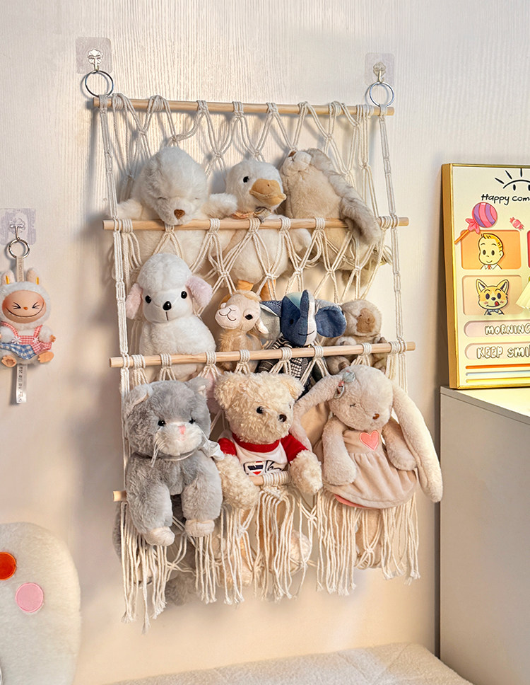 木製の棒と編み込まれた紐で作られた四段構造で、たくさんのぬいぐるみをディスプレイしながら収納できます。
