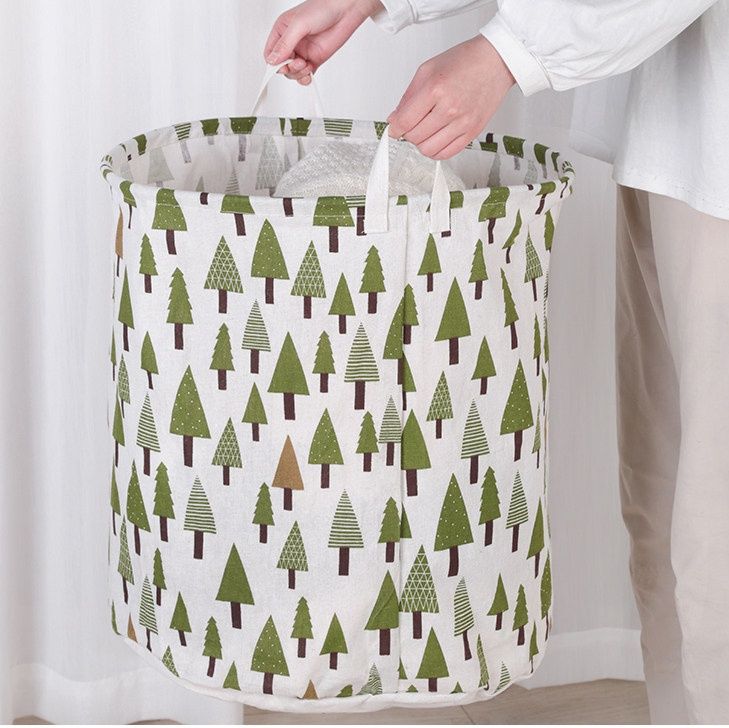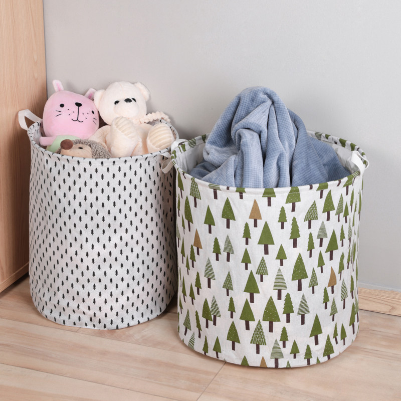 おしゃれな北欧風の幾何学模様と樹木柄が魅力的な円筒型のぬいぐるみ収納ボックスです。